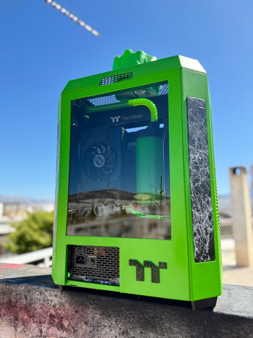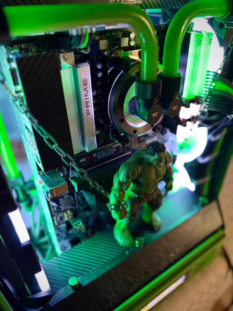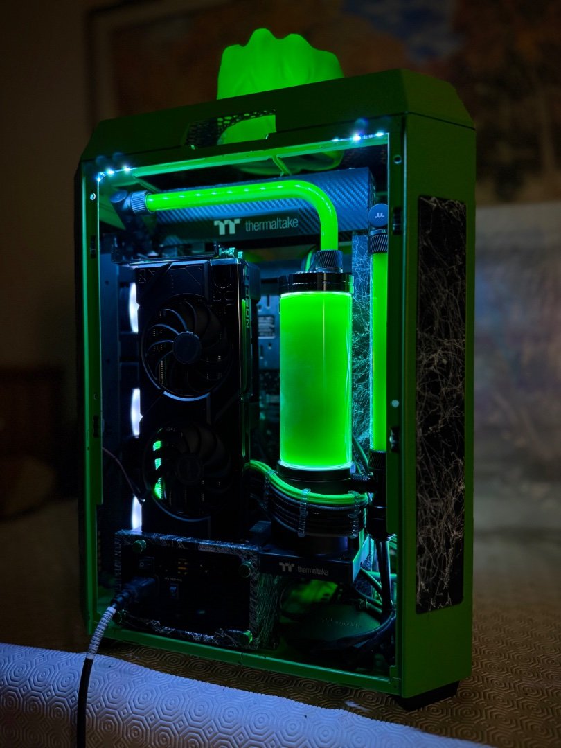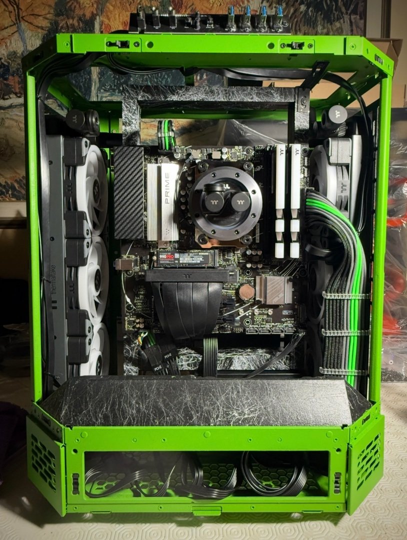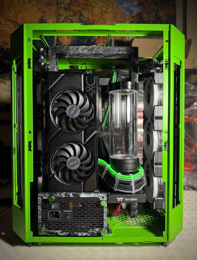 Big update here ! As the modding deadline is close , and only few weeks left , i have to be rush ! So placed the custom motherboard tray to the case by drilling some holes, measure it up to be straight , and screw it up . I make ย also some holes to the mb tray ย to put standoffs and place motherboard and pump-res combo . As you can see I moved the mb tray more to the front to have enough space to fit gpu and pump-res combo to the back side of the case which will be visible by the custom window panel I made .Then placed a custom gpu mounting bracket screwed to the rad and ย fans and power it up with a long riser cable . It fits like a glove as I planed from the first time I thought about it . Plus the double 360 Rads that gonna cool the 9800x3d fair enough . Fans on the left side was in reverse so can take some fresh air and on the right rad ย is exhaust . Seems like a tight setup , but I wanted to get full potential of space and cooling by the case, ย and fill up the case as much as I can . Now I have to take care of the top panel that as you can see from the previous post ย has a big hole on the center . Something ย special gonna fit there . After that I have to plan the custom loop runs and start bending , also do some final themed touches and better cable managing . ย Still you canโt guess the theme ? ๐