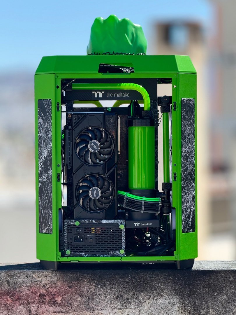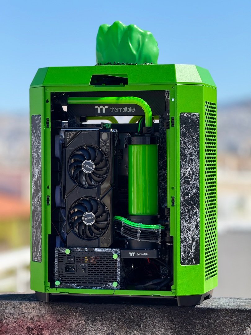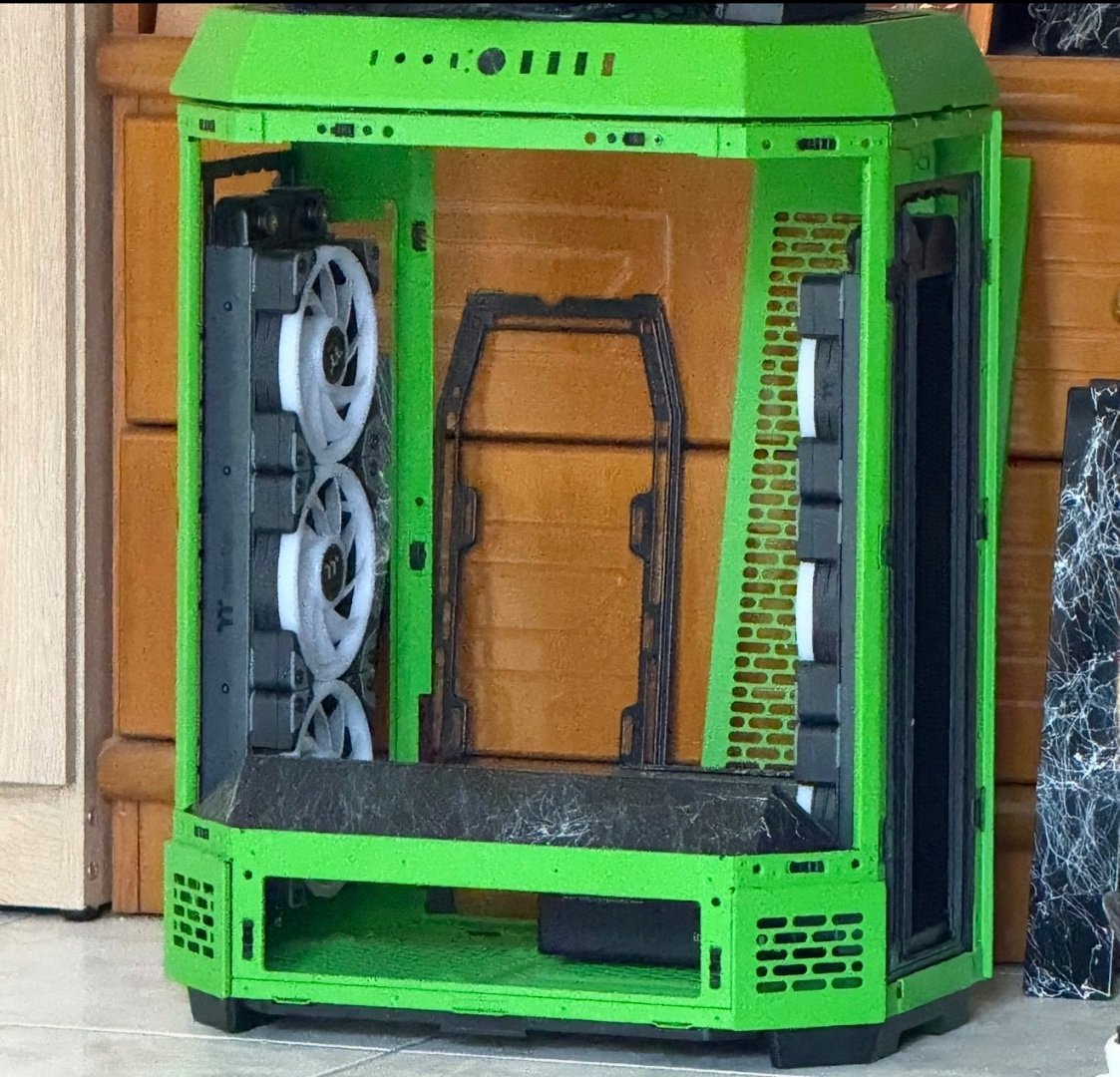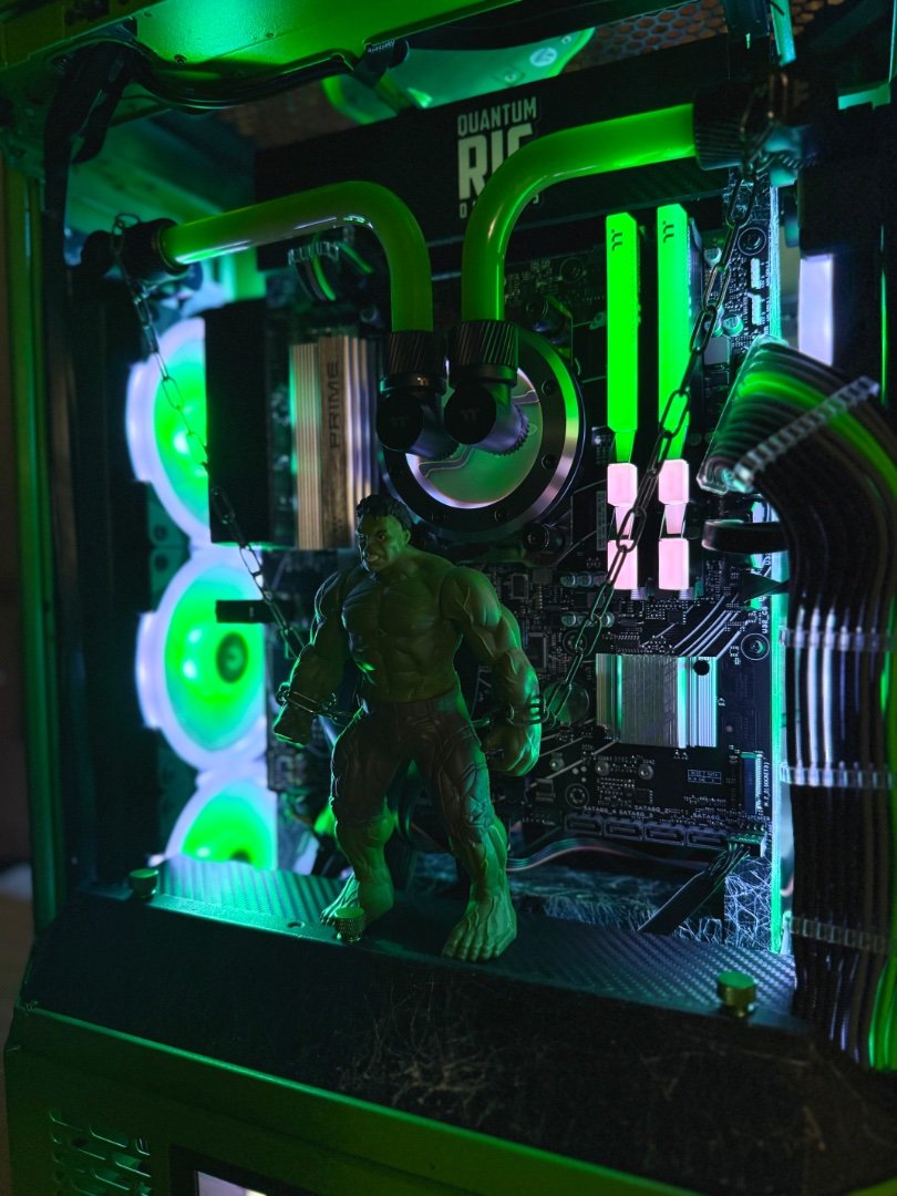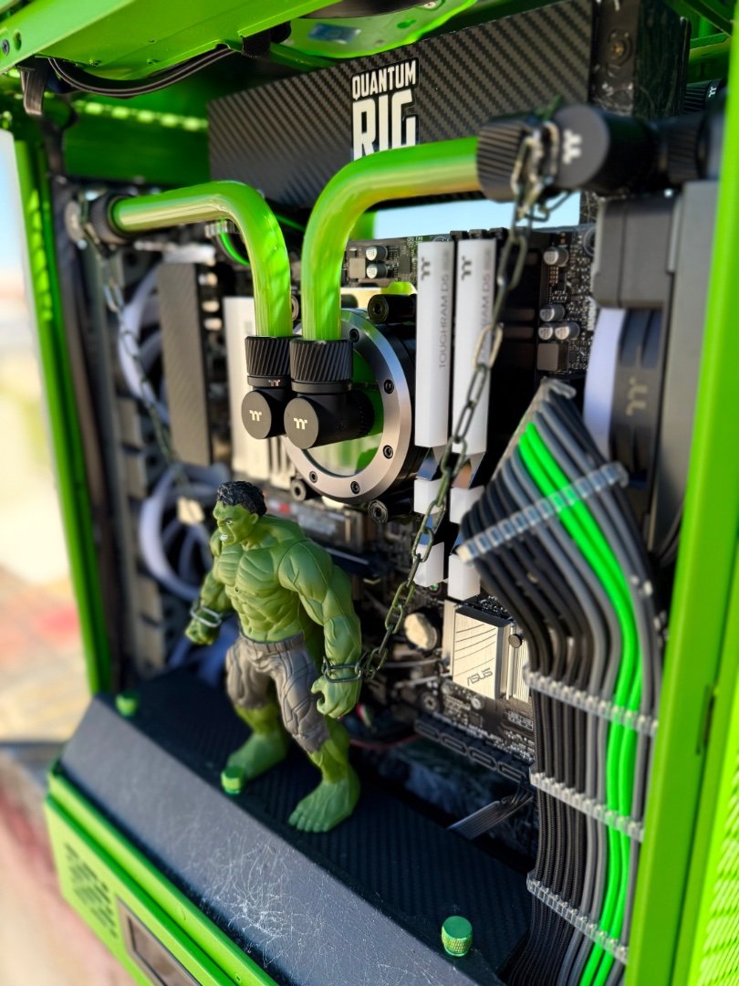 Big update here ! As the modding deadline is close , and only few weeks left , i have to be rush ! So placed the custom motherboard tray to the case by drilling some holes, measure it up to be straight , and screw it up . I make ย also some holes to the mb tray ย to put standoffs and place motherboard and pump-res combo . As you can see I moved the mb tray more to the front to have enough space to fit gpu and pump-res combo to the back side of the case which will be visible by the custom window panel I made .Then placed a custom gpu mounting bracket screwed to the rad and ย fans and power it up with a long riser cable . It fits like a glove as I planed from the first time I thought about it . Plus the double 360 Rads that gonna cool the 9800x3d fair enough . Fans on the left side was in reverse so can take some fresh air and on the right rad ย is exhaust . Seems like a tight setup , but I wanted to get full potential of space and cooling by the case, ย and fill up the case as much as I can . Now I have to take care of the top panel that as you can see from the previous post ย has a big hole on the center . Something ย special gonna fit there . After that I have to plan the custom loop runs and start bending , also do some final themed touches and better cable managing . ย Still you canโt guess the theme ? ๐