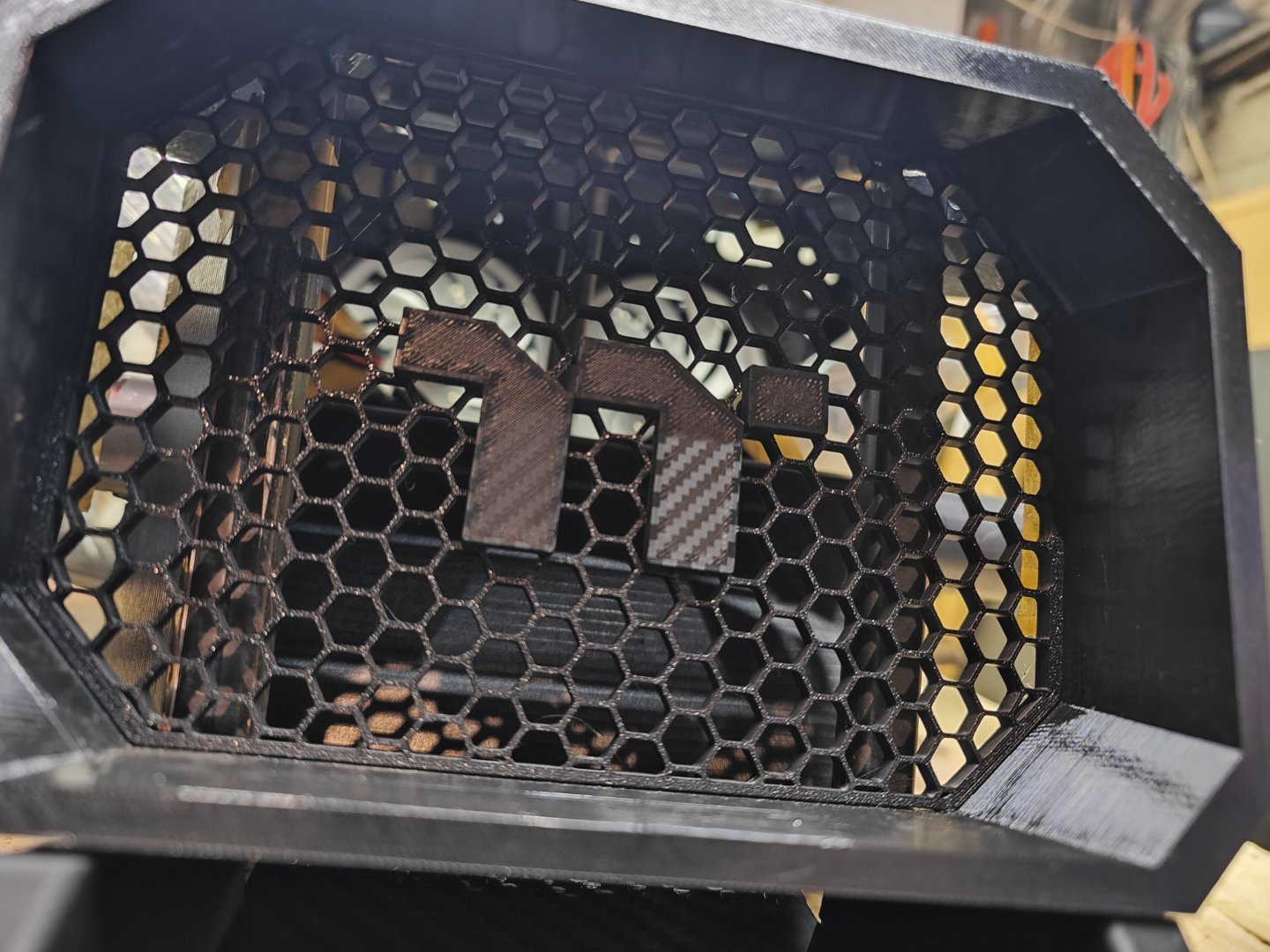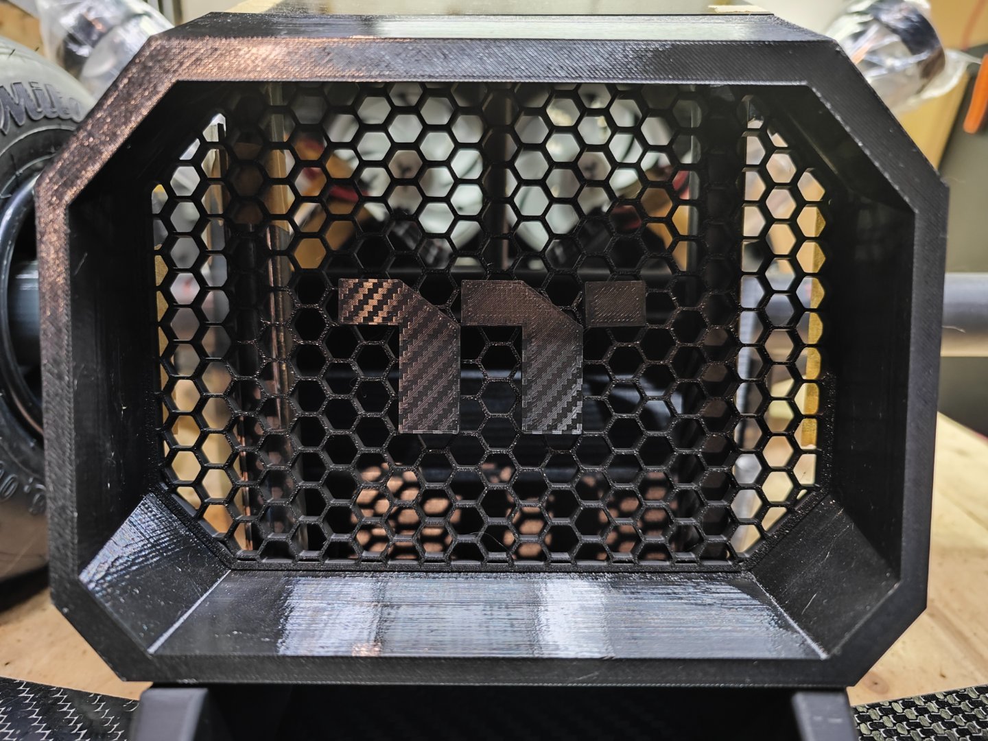 AlexMa3x Posted October 6 Author Report Posted October 6 3D printing is not making always good finish - so details had to be sanded, then bondo, then fillet and in the end 2 coats of black painting I also painted the bolts with the same paint Made new hexagonal mesh for the gril using the same szie from the internal elements of tower 600 that use hex mesh Also made a TT logo with the same carbon look - what is better the black or the red and black version ? Pcustomod, hammera, stefanpavic and 1 other 4 Quote