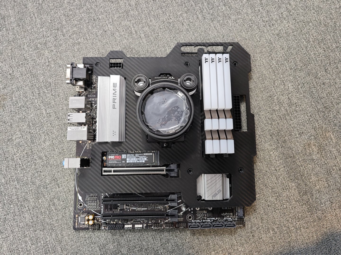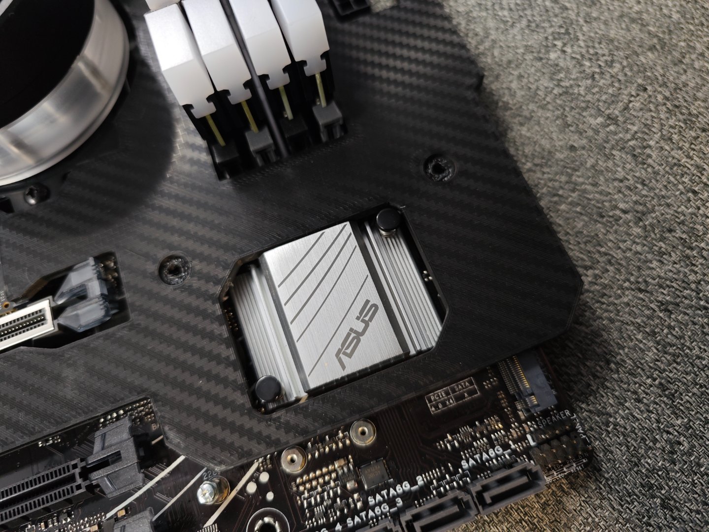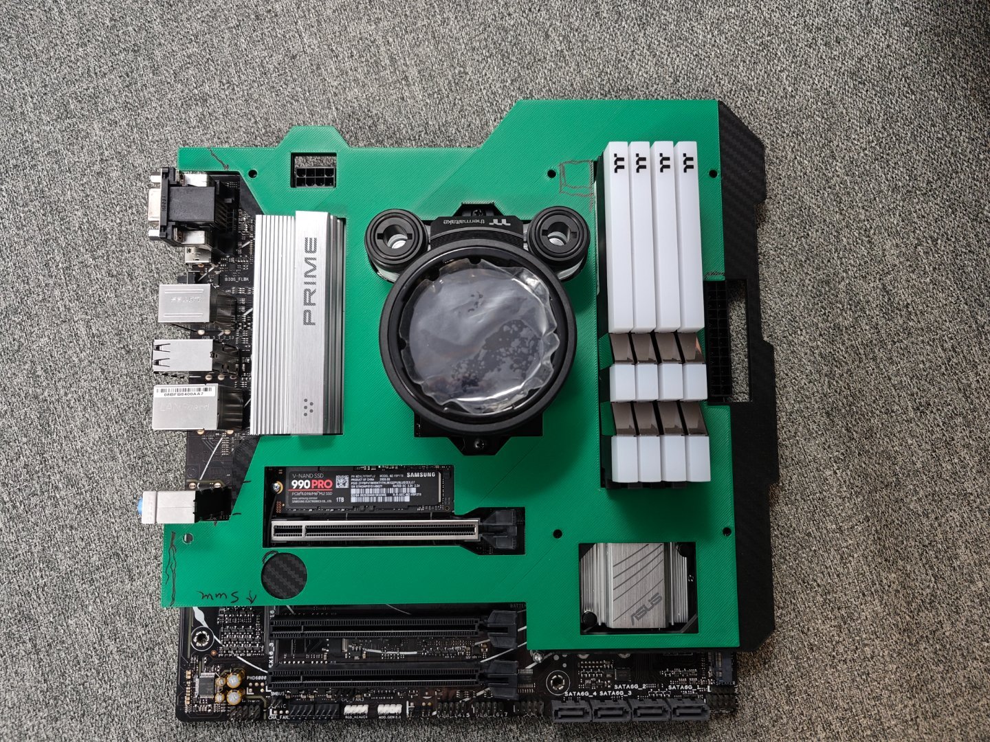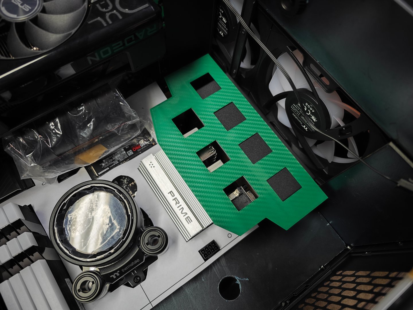 AlexMa3x Posted October 20 Author Report Posted October 20 Let’s make some mods inside the build as well. I’m aiming for a minimalist look on the inside and plan to copy the carbon idea for the exterior of TT Formula casemod. Since real carbon fiber is expensive (both the material and the waterjet cutting), and a bit risky to use around electronic components, I decided to 3D print fake carbon parts instead. 😅 I took measurements from the board and internal elements of the TT Tower 600. Then I decided to cover the ASUS motherboard as much as possible and integrate all the main components—TT water block, TT RAM, Samsung SSD, and the ASUS MB heatsink—into this decorative carbon-style cover. I created a CAD drawing, exported it, and turned it into a 3D model. After that, I printed green mockups/prototypes to double-check the dimensions before printing the final part. All the side panels were also covered with 3D printed PVC pieces wrapped in 4D carbon vinyl. In the end, each 3D printed “carbon” part was spray-painted with matte lacquer. (I got a bit carried away during the process and forgot to take photos. 😅) hillcho and PCCrazyDario 2 Quote