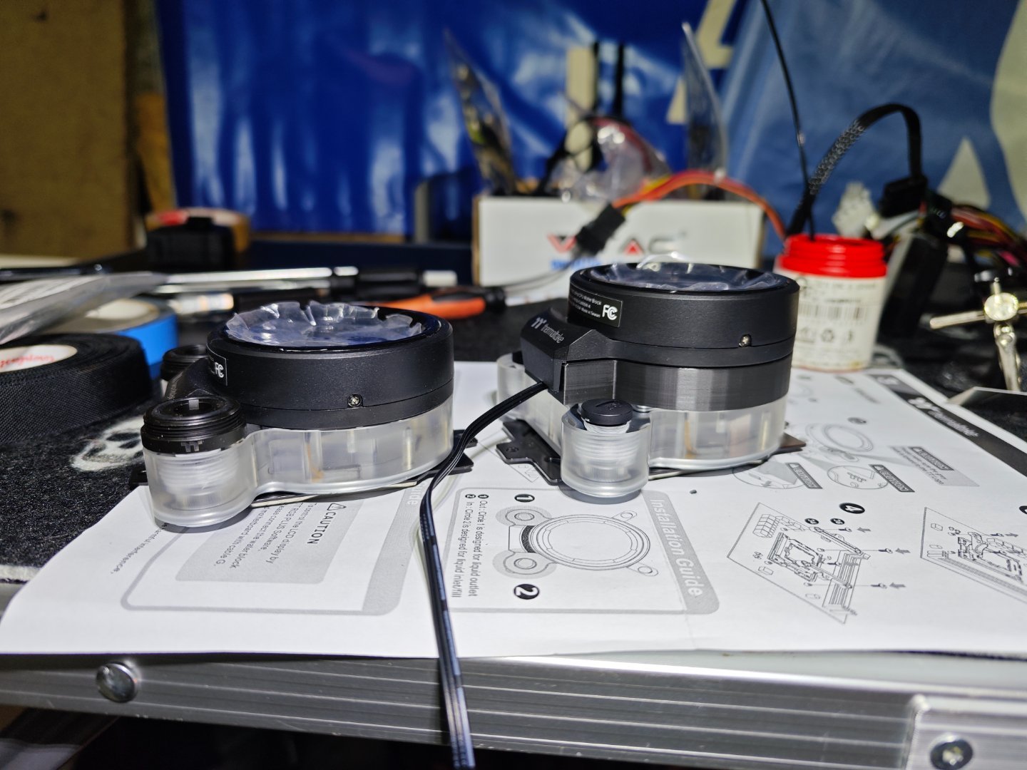 AlexMa3x Posted November 1 Author Report Posted November 1 I also added more lighting for the two TT D5 pumps. The original design uses top ARGB LED lights that can be controlled through TT RGB PLUS Software I will use that software and the predefined animations to create a rotating effect — simulating a futuristic engine. However, based on my experience with custom water cooling, such a long reservoir needs additional lighting in the lower section. So, I made two rings with internal channels for red LED strips that will shine directly into the liquid, creating a glowing effect — like hot steel or a red-hot engine. Quote